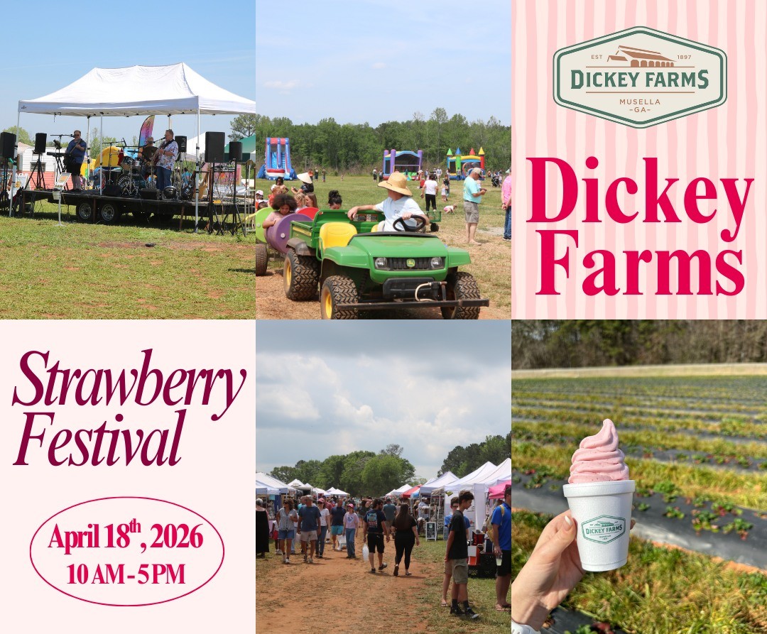 Bring your family to Dickey Farms in Musella, GA on Saturday April 18th, 2026 for their Annual Strawberry Festival! There will be live music, local vendors, food trucks and more! Admission is free and the event starts at 10AM.