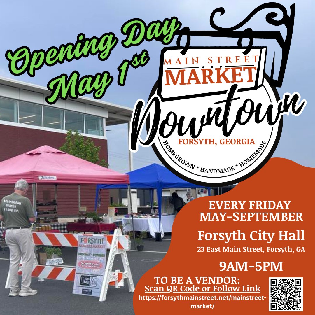 Every Friday beginning in May and lasting through September, purchase fresh fruits, vegetables, honey, dairy, artisan crafts, and natural and organic goods from local farmers at the Main Street Market. Stop by anytime 9:00 a.m. – 5:00 pm at Forsyth City Hall.