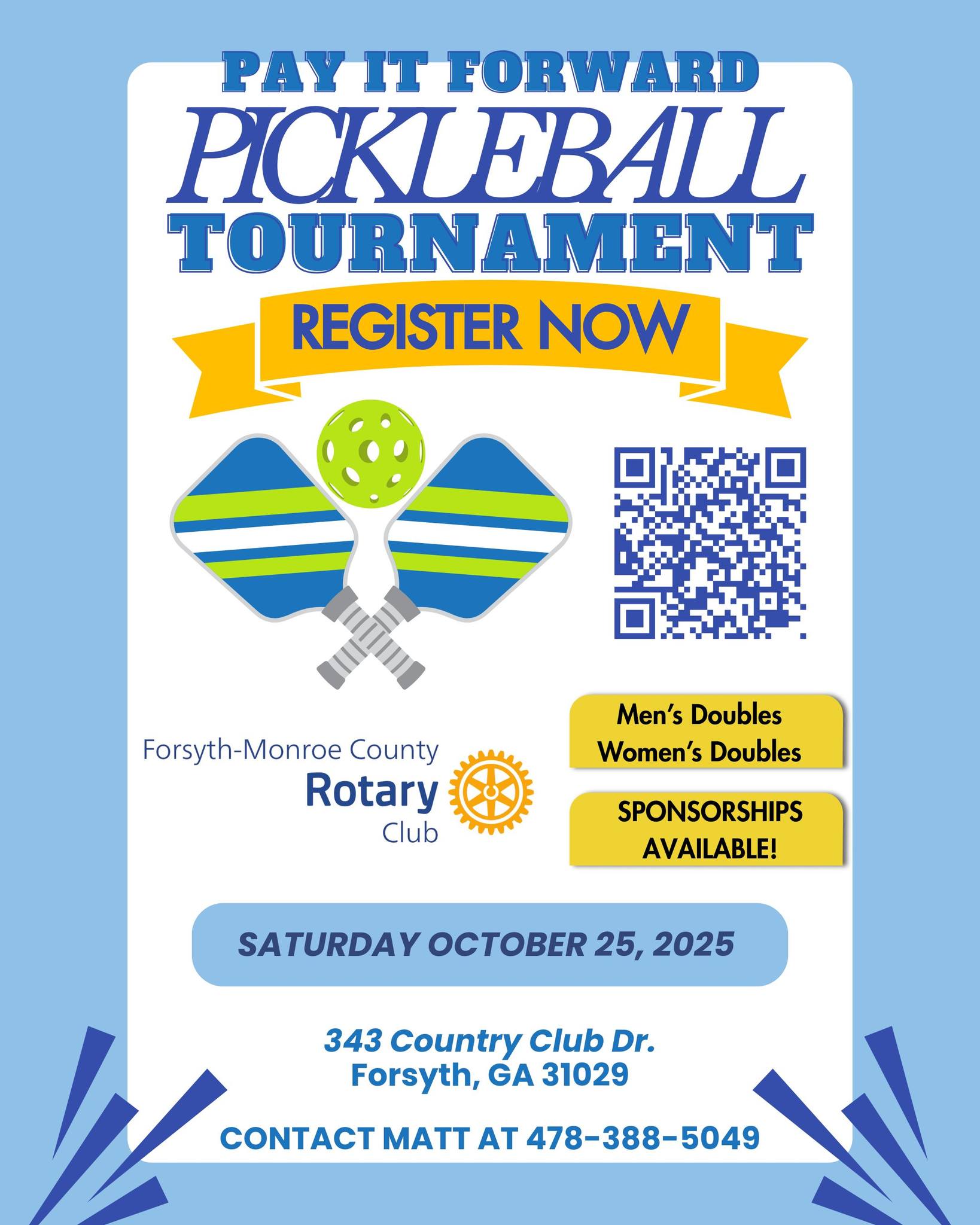 The Forsyth-Monroe County Rotary Club will be hosting their inaugural Pickleball tournament on Saturday October 25, 2025. The tournament will be the first one held at the new Pickleball courts at Country Club Park in Forsyth!