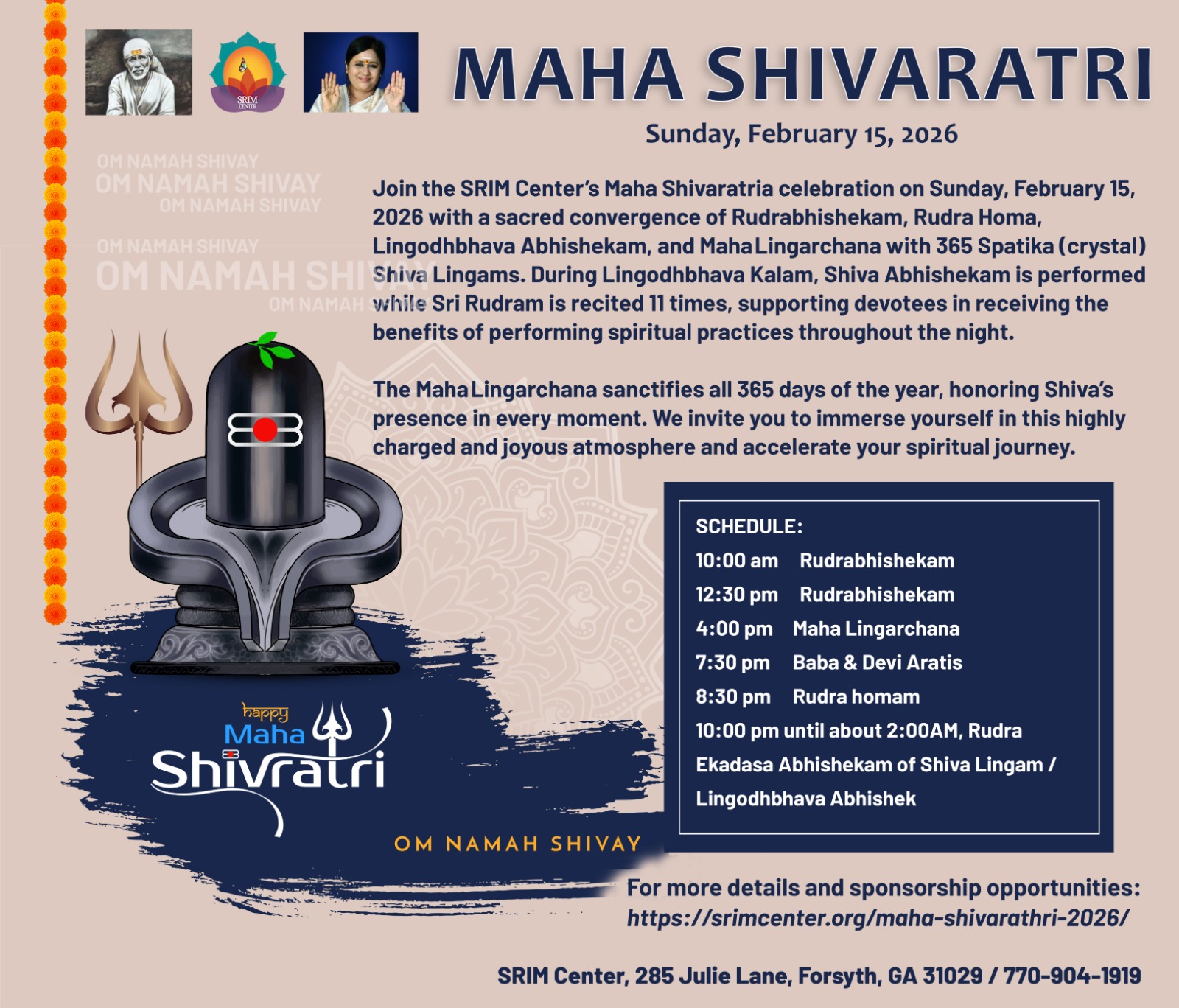 Srikarunamayi Research Institute of Meditation Center, Inc. is hosting Maha Shivaratri on Sunday, February 15, 2026.