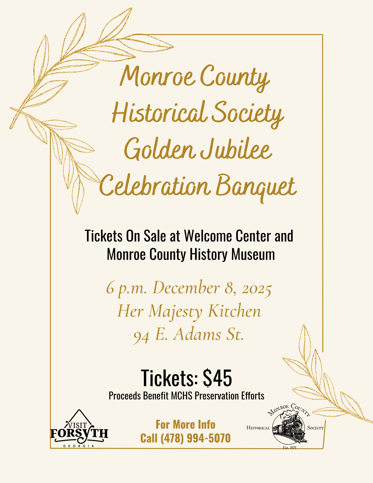 Come celebrate the Monroe County Historical Society’s Golden Jubilee on Monday, December 8, 2025. The banquet will be held at Her Majesty Kitchen and starts at 6PM. Purchase tickets at the Depot, the Welcome Center or from the MCHS Website.