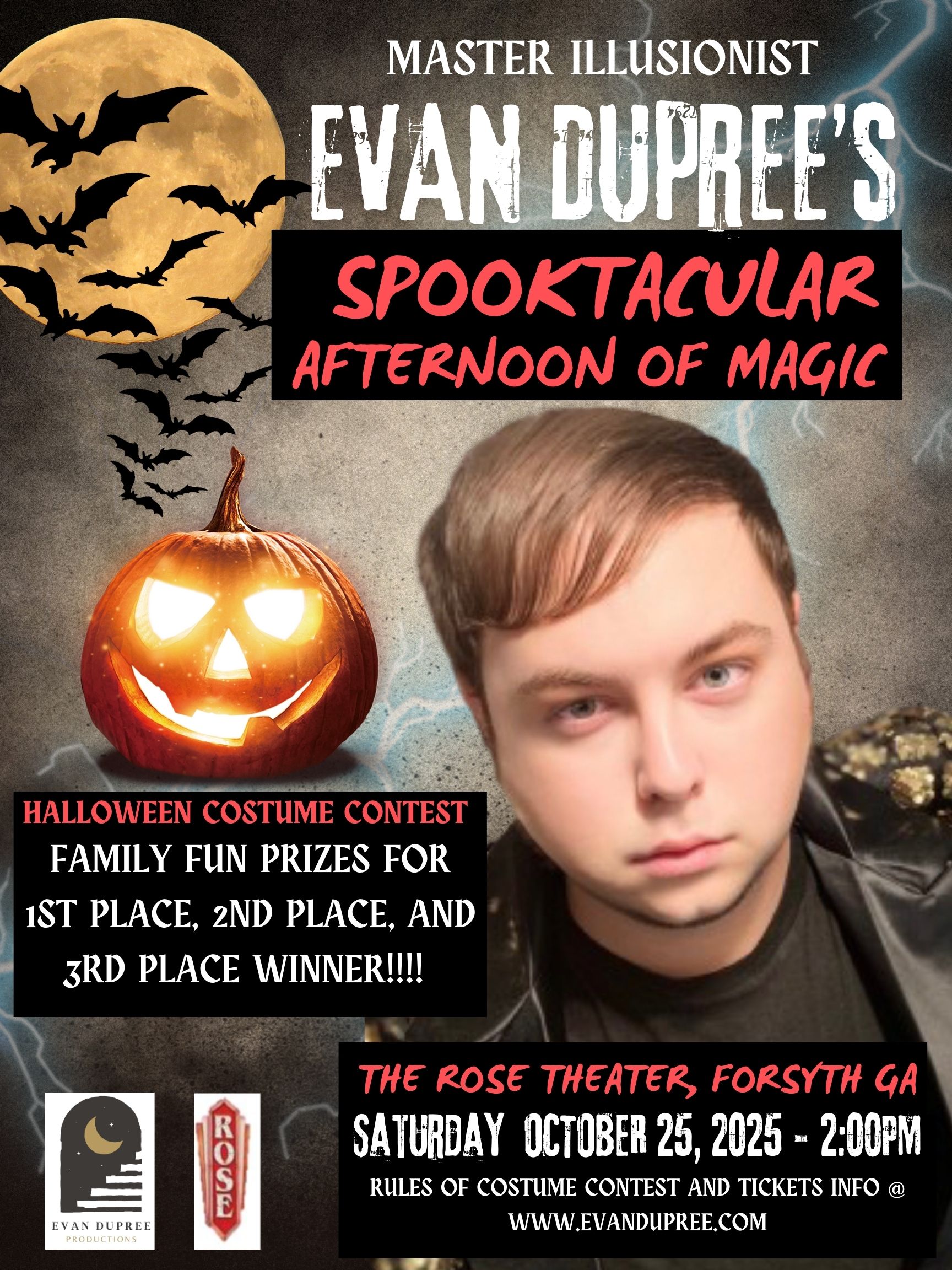Join Master Illusionist Evan Dupree for an afternoon of spooky magic and delight! There will be a costume contest with prizes awarded to 1st, 2nd, and 3rd place. The show starts at 2PM at The Rose Theater on the square so come on down for some Halloween fun!