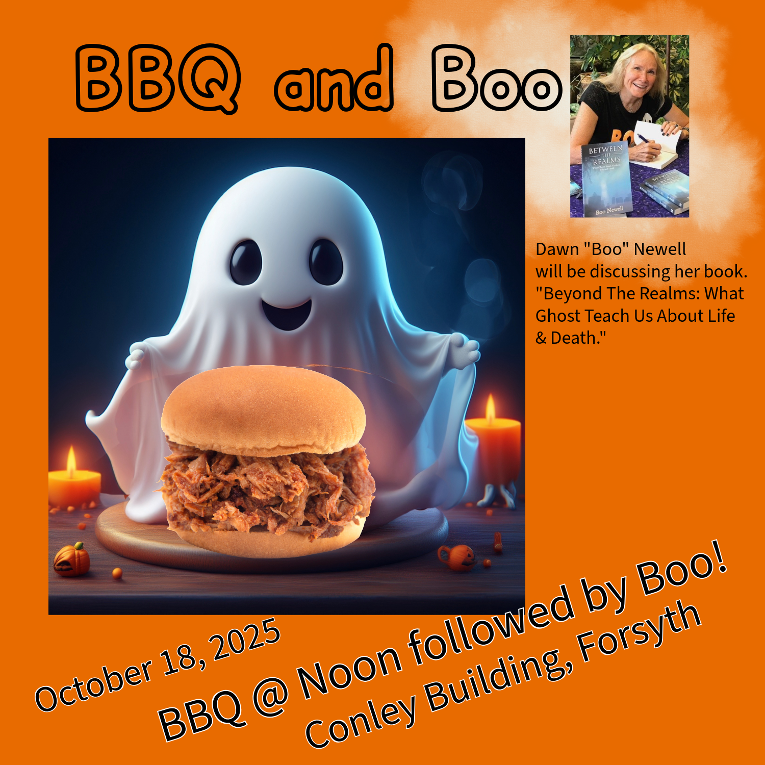 Head to the Conley Building on Saturday, October 18th to hear a presentation from author, Dawn “Boo” Newell. Boo is a Tift College graduate and will be speaking about her book, “Between The Realms: What Ghosts Teach Us About Life and Death.” Come at 12PM for some delicious BBQ and spooky tales!