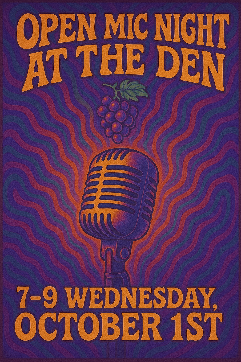Head down to The Den on Wednesday October 1, 2025 for Wednesday Night Open Mic with Roy Howdy. Whether you’re there to sing or just enjoy the music, it’s a great way to relax on a Wednesday night! Sound, piano, percussion provided and maybe a guitar or two. However, you’re welcome to bring your own instrument. See ya’ll Under The Grapes!